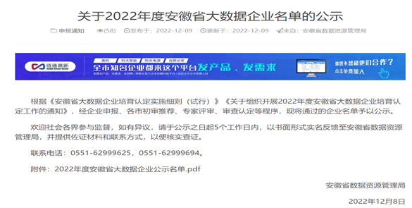 公司通過2022年度安徽省大數(shù)據(jù)企業(yè)認(rèn)定